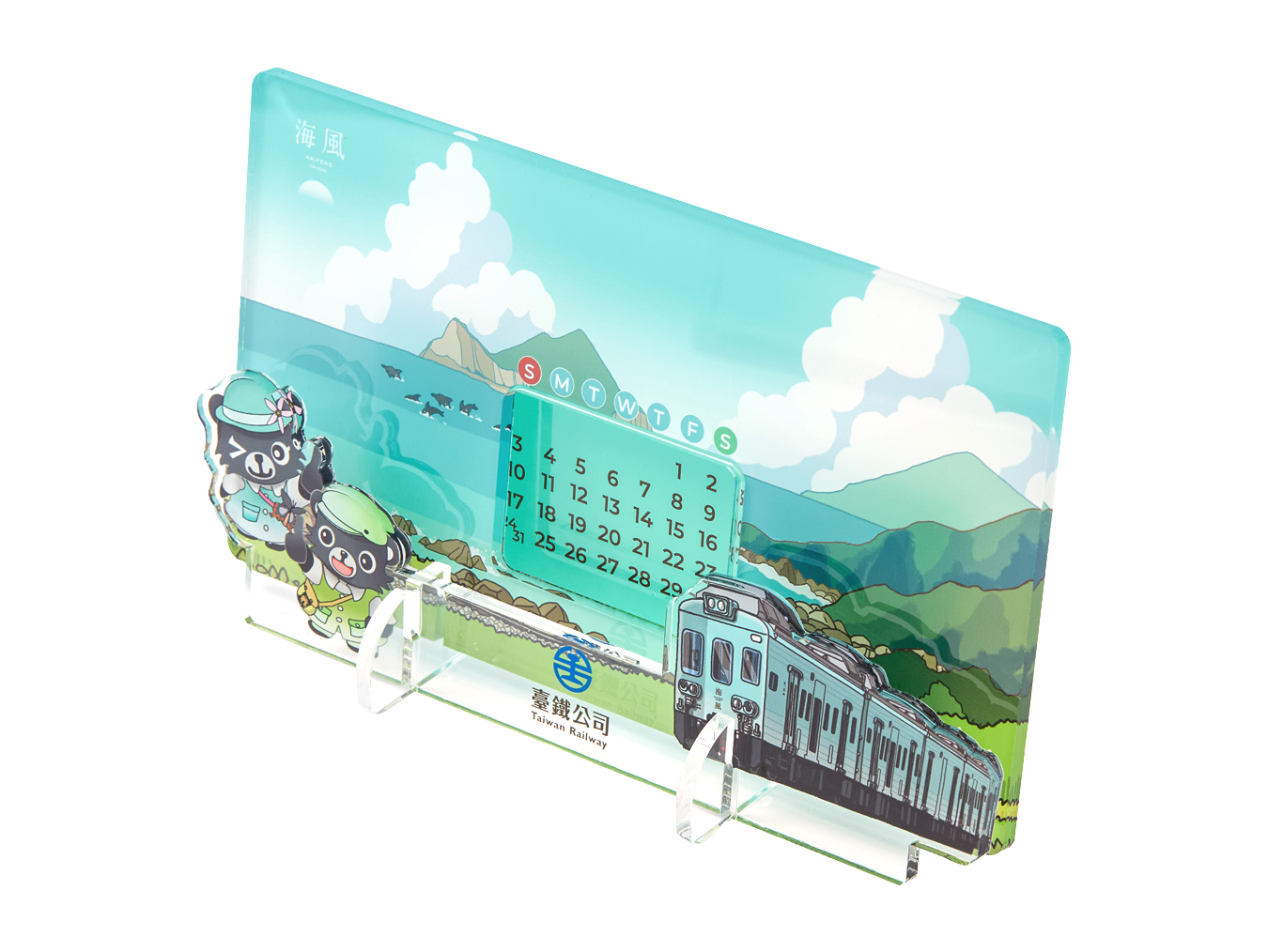 以「海風號」與海岸插畫打造的透明壓克力萬年曆,可依每月開始星期自行調整位置,能永久使用。