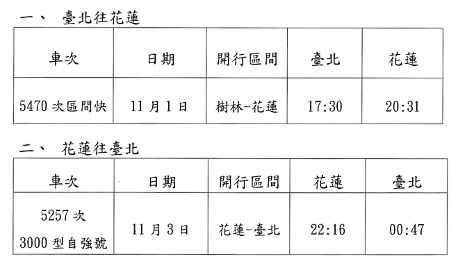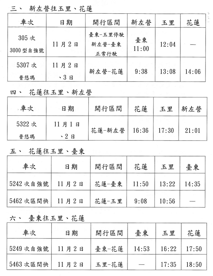 二、因應11月1日至3日「2024 Just Love It!一路向東」,臺鐵公司停駛列車如附圖。