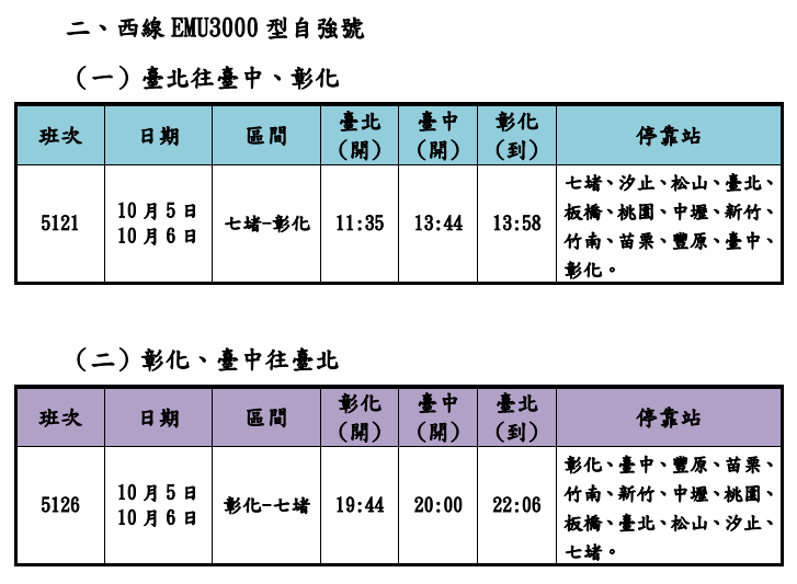 因應中秋連假期間返鄉(工)需求增加,為加強服務旅客,於114年10月5日至10月6日加開七堵=彰化EMU 3000型自強號4列次、10月6日加開樹林=花蓮太魯閣號2列次,可再增加座位數共計2,904個,整體運能較平日增加6.2%。