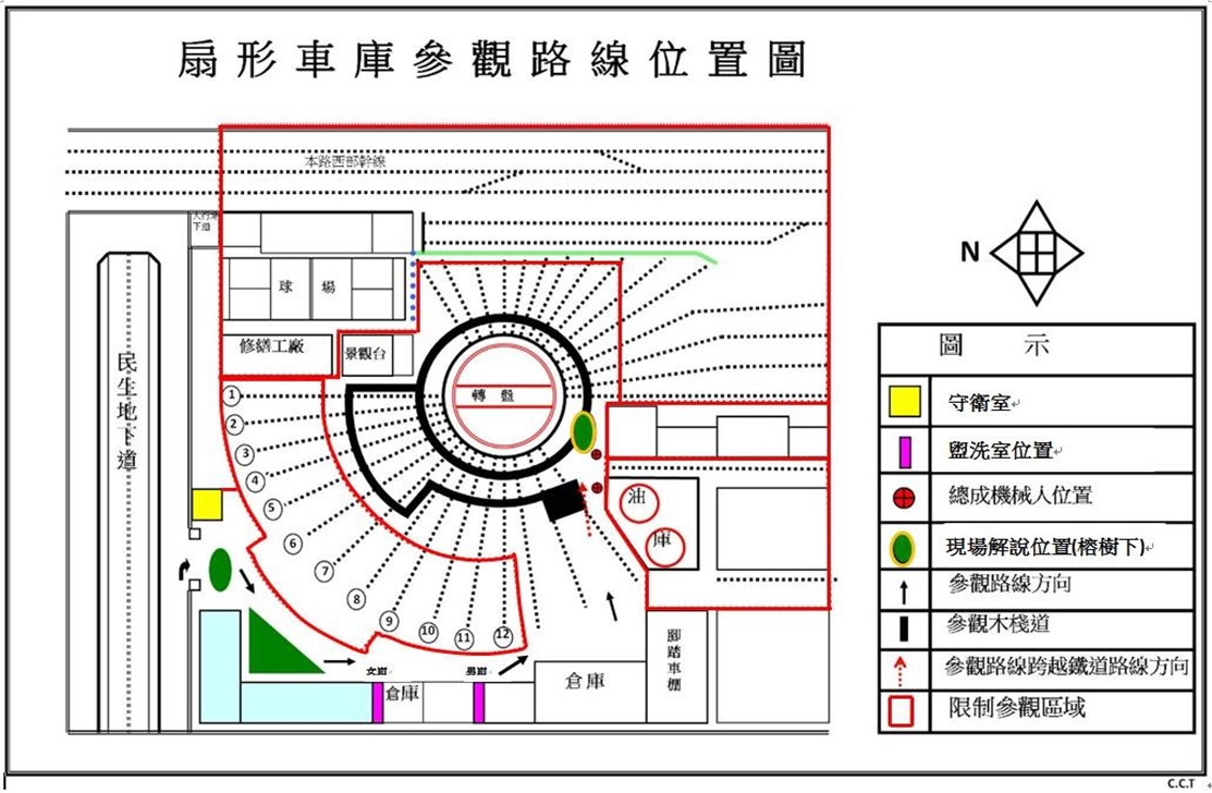 1. 扇形車庫開放參觀區域為榕樹下、觀景台及木棧道,如參觀路線示意圖所示。
