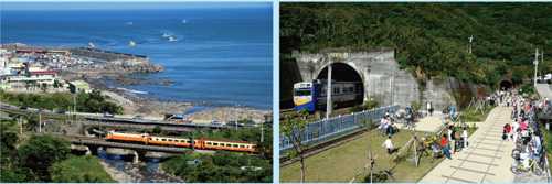 「舊草嶺隧道」位在「新草嶺隧道」旁邊,騎乘單車時,偶爾還能聽到火車的隆隆聲。「舊草嶺隧道自行車道」是以「鐵道博物館」的概念設計,不但單車道路面是以仿造鐵路鐵軌的型式建造,照明燈具也是使用具有復古風味的油燈燈罩、同時利用隧道的避難洞口營造「火車行駛的音效、並且於其中裝置許多珍貴的鐵道文物」。