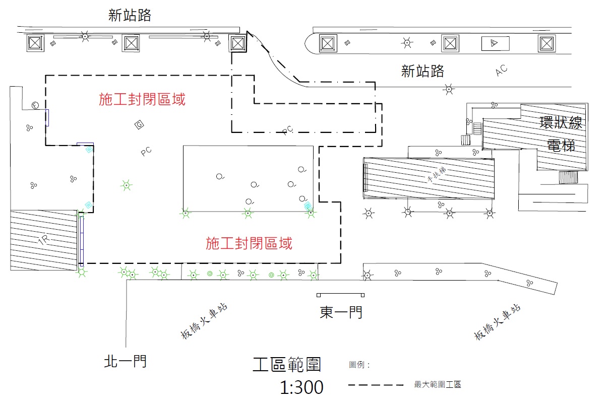 因新北市政府捷運工程局執行「環狀線板橋站新增出入口工程」,板橋火車站東一門至北一門外將進行封閉施工(如附圖),預計2027年完工,敬請往來民眾注意,造成不便敬請見諒。
